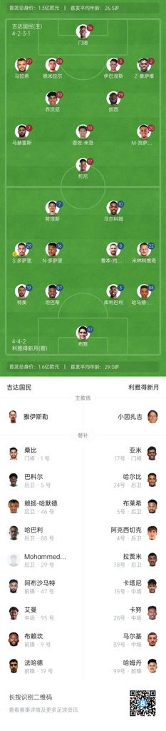 吉达国民首发:16-门迪、27-马拉希、28-德米拉尔、3-伊巴涅斯、2-Z-豪萨维、30-乔汉尼、79-凯西、7-马赫雷斯、10-恩佐-米洛、20-M-贡萨尔维斯、17-托尼